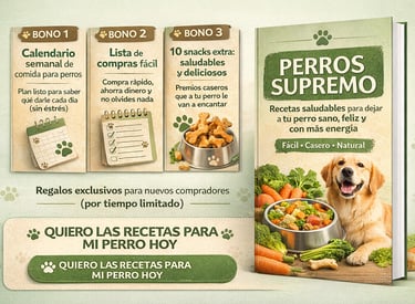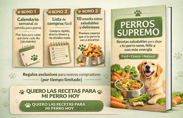 Perros Supremo es una guía práctica con recetas saludables para que tu perro esté más sano, feliz y con más energía en solo 7 días.