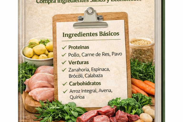 Una lista práctica y visual con los ingredientes esenciales para una alimentación saludable de tu perro, perfecta para comprar rápido en el mercado y no olvidar nada importante.