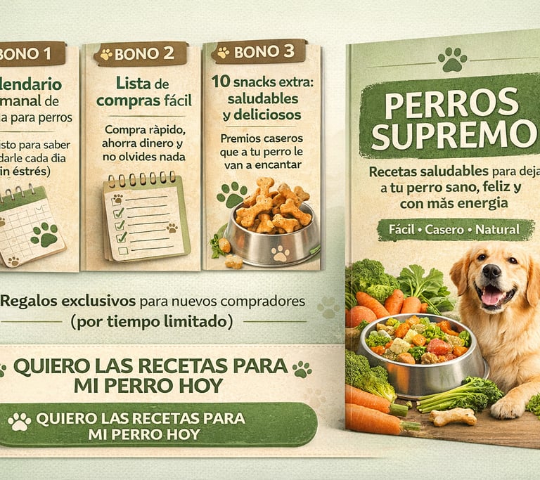 Muchos dueños aman a su perro, pero se sienten perdidos y sin claridad sobre qué darle de comer. Intentan mejorar su alimentación, pero se frustran por no saber qué es realmente saludable o cómo preparar comidas seguras. Perros Supremo es la guía visual que te toma de la mano y te acompaña paso a paso para alimentar mejor a tu perro cada día, de forma fácil y natural.